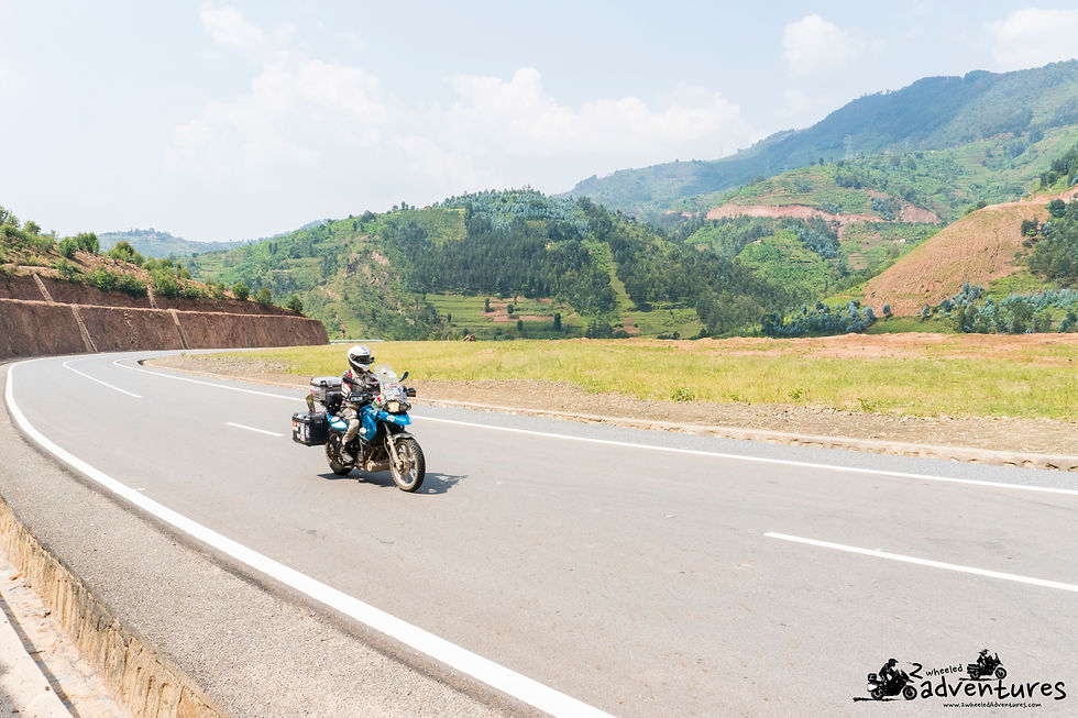 Roads: Driving on the right side of the road. Most of the main roads are newly built and of perfect quality. The road NR11 from Gisenyi south (all along Lake Kivu) to Buhinga and then the road NR10 through Nyungwe Forest National Park and all the way to Huye (Butare) are the most perfect paved riding roads in Africa - with perfect scenery all along the way, extremely low traffic and never ending twists and turns all the way. The speed rarely exceeded 80 km/h and there were lots of villages with speed limit of 40 km/h, but there were no speed bumps any all and it was a pure joy to ride these roads on motorcycles.